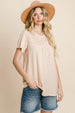 An eyelet round neck short sleeve top is a chic and feminine piece that features delicate eyelet fabric detailing around the neckline. This type of top offers a sophisticated and elegant look with a touch of texture and visual interest. The round neck design adds a classic silhouette to the top, while the short sleeves provide comfort and breathability, making it a versatile option for various occasions. Whether worn with jeans for a casual outing or dressed up with a skirt for a more elevated look, the eyelet round neck short sleeve top is a stylish choice that can effortlessly enhance your wardrobe with its timeless charm and contemporary appeal.