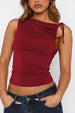 This stunning ruched tied solid color tank top features a sophisticated burgundy wine shade with elegant side ruching that creates a flattering, form-fitting silhouette. The adjustable shoulder tie detail adds a unique asymmetrical design element while allowing for customizable fit. Made from premium stretch fabric blend that offers comfort and durability. The sleeveless design makes it perfect for layering or wearing alone during warmer seasons. The solid color design provides versatility for pairing with jeans, skirts, or shorts. The ruched detailing along the side creates visual interest and helps accentuate the waistline. Perfect for casual outings, date nights, or everyday wear with its comfortable yet stylish construction.