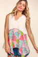 The Patchwork Shark Bite Color Block Tank is a trendy and unique piece for your wardrobe. The patchwork design and color block detailing create a bold and edgy look. The shark bite hem adds an interesting asymmetrical touch to the tank top. Pair it with high-waisted jeans or shorts for a stylish and modern outfit. Stay on-trend and make a statement with this eye-catching tank top that is perfect for any casual occasion.