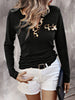 This stylish long sleeve t-shirt features a classic black base with eye-catching leopard print pocket detail that adds a fashion animal print accent. Made from soft cotton blend material for all-day comfort, this versatile top offers a relaxed fit perfect for casual wear. The contrasting leopard trim creates a fashionable focal point while maintaining an effortless street style aesthetic. Perfect for layering or wearing alone, this t-shirt combines comfort with contemporary fashion appeal.